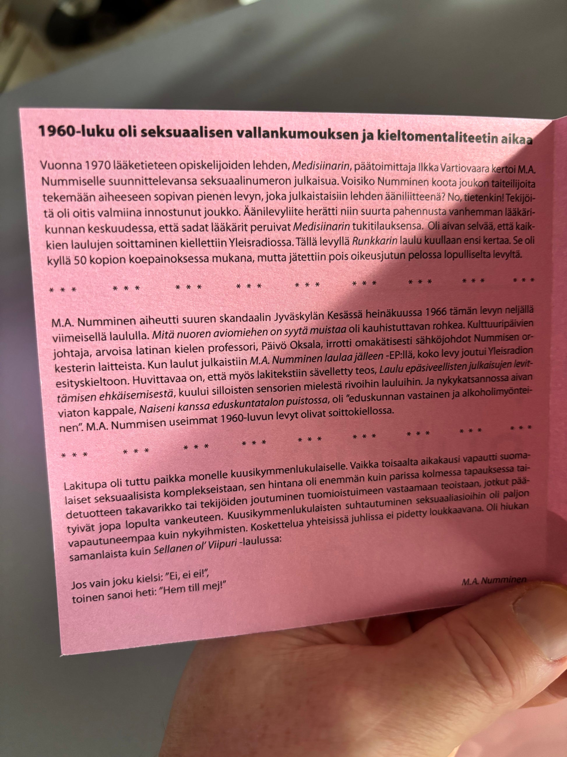 Legendary and many feelings rising M.A. Numminen’s quite freaky tracks originally from 1966 & 1970, Finland!!!<3 Feats. Rauli Badding Somerjoki, Heikki Kinnunen, Liisamaija Laaksonen, Kari Rydman, Muksut & Juha Virkkunen!!!<3 Bonus: Forbidden SEX-EP!!!:O<3 M.A. Numminen is TRUE PUNK ATTITUDE ARTIST. He have done always stuff what he wants<3